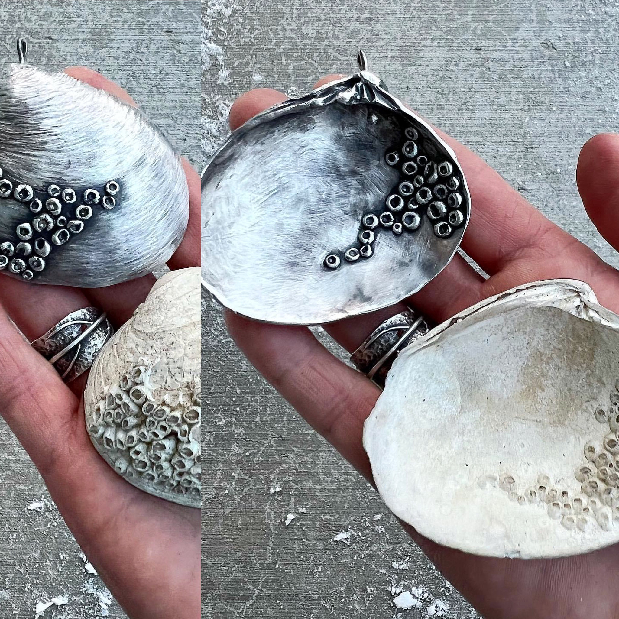 This is a detailed tutorial on how to saw, form, fuse, solder, and carve a shell with barnacles. 1-on-1 meeting included. Advanced level. 3"x3" SS sheet, 22 gauge 16 gauge SS wire Miniature stake set OR dapping block with vise Saw/blades A torch, size #6 tip for Little Smith oxy/propane Cross-locking tweezers Flex shaft Hammers Carbide bur Separating disc Hard, medium and easy solder Ball bur